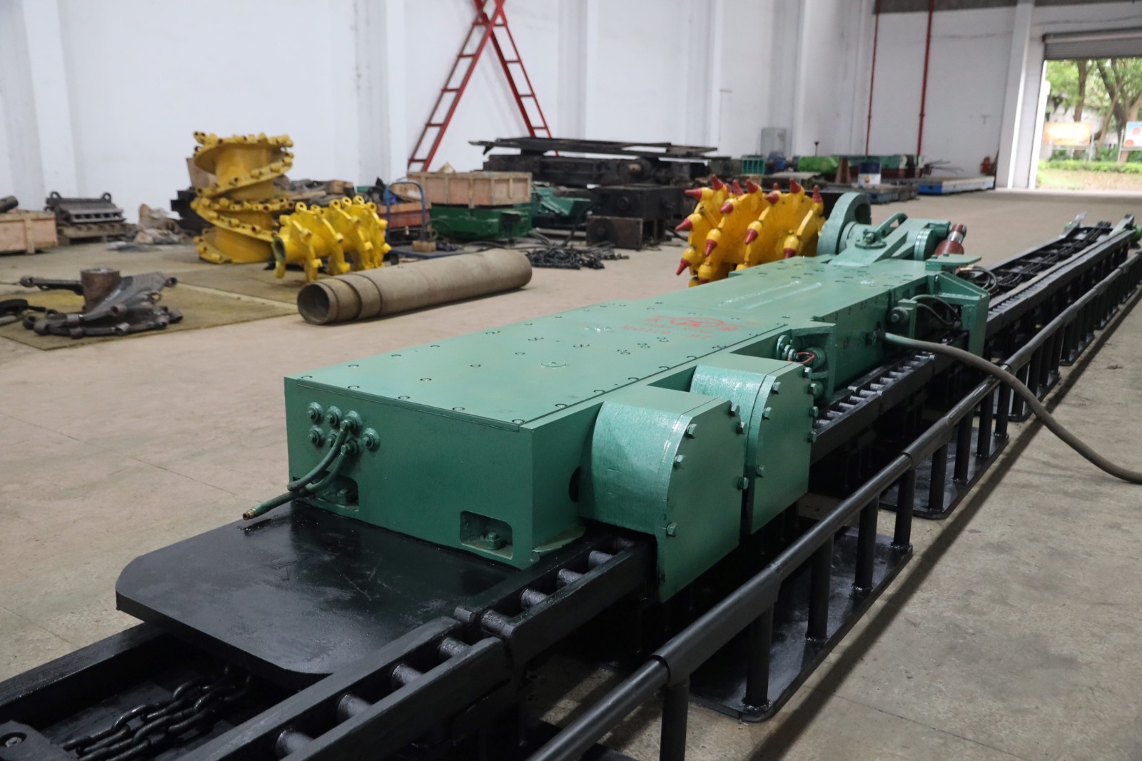 結(jié)構(gòu)特征 騎溜式、單搖臂、液壓牽引薄煤層滾筒式采煤機(jī)。